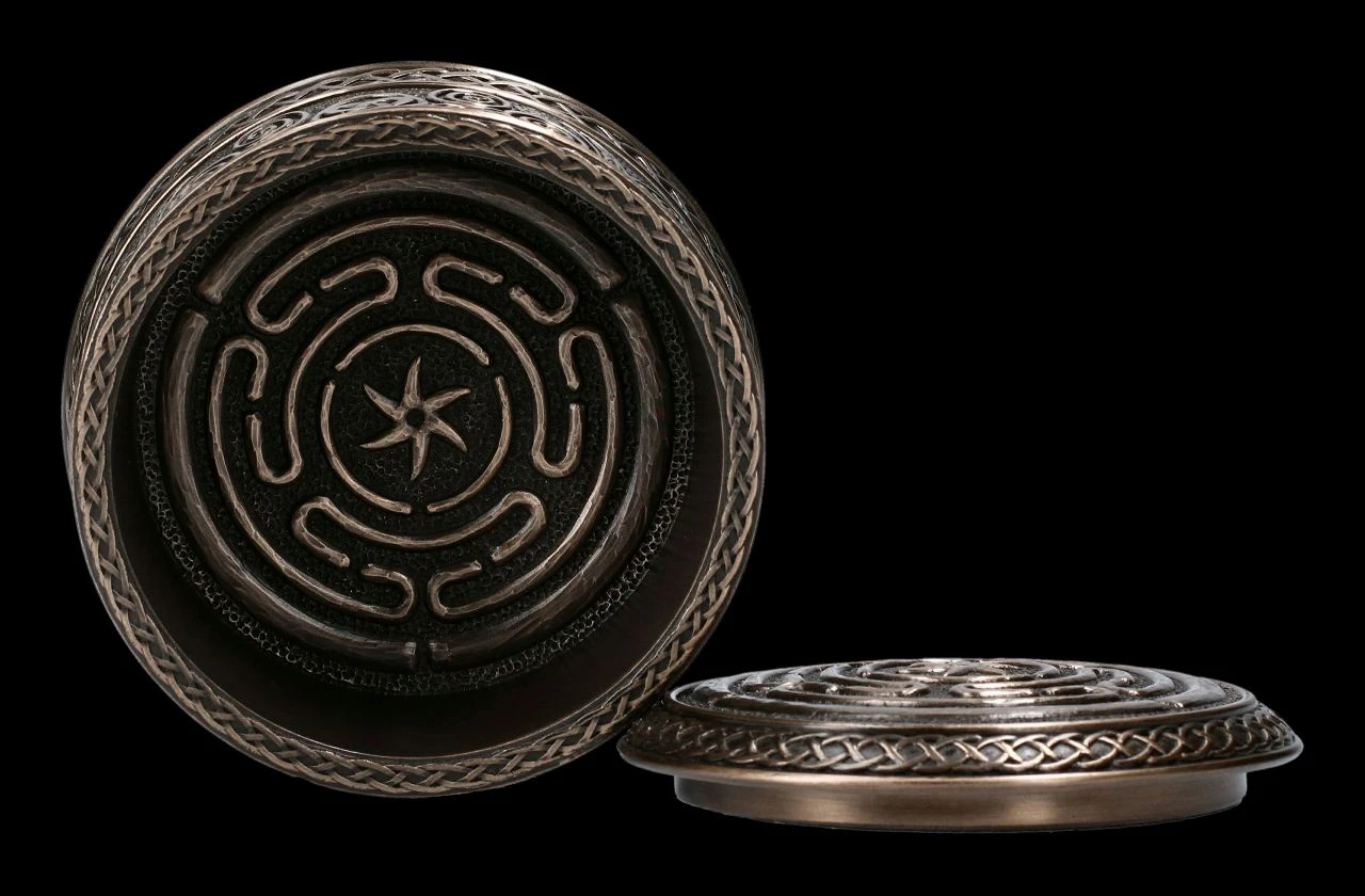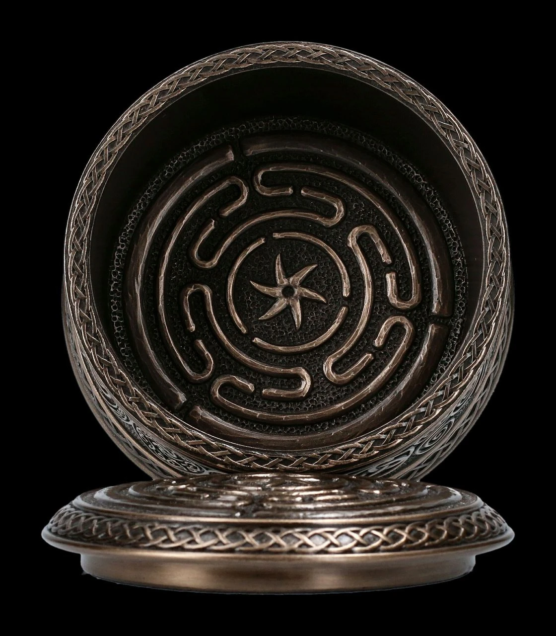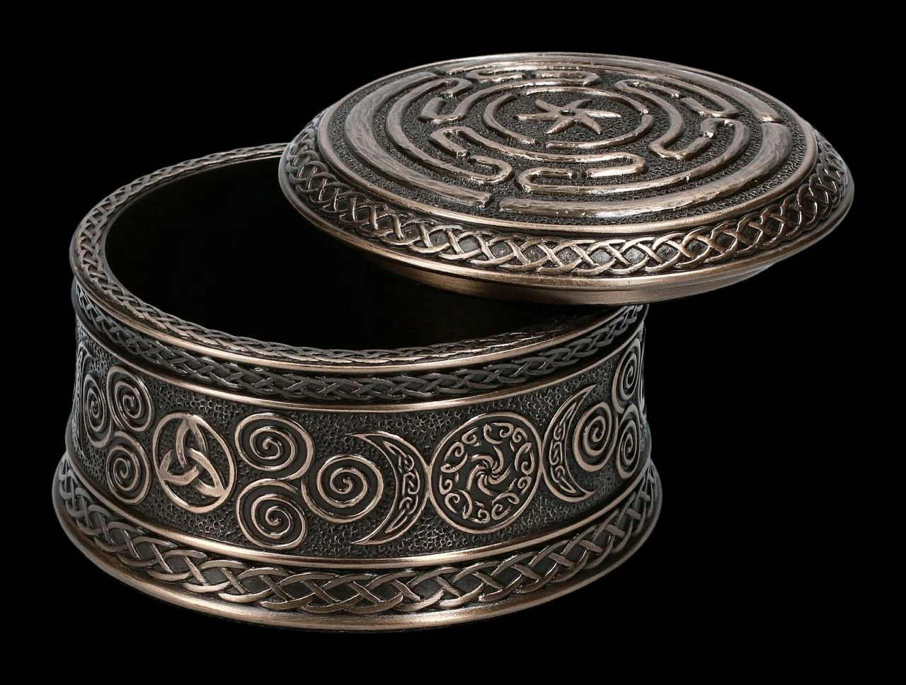Das Rad der Göttin Hekate – auch die Dreifach Göttin genannt – dient bei dieser fantastischen Schatulle hervorragend als geheimnisvolle Aufbewahrung für magische Informationen. Wunderbar mit Dreifachmond und keltischen Bordüren verziert, bietet die detailreich aus edel bronziertem und fein coloriertem Kunststein (Polyresin) gefertigte Schatulle aus der Studio Collection von Veronese mit ihrer Höhe von 5 cm (Innen 4 cm) und dem Durchmesser von 10 cm (Innen 8 cm) den perfekten Platz für Dinge, die beschützt werden sollen. Sie ist aber auch eine wunderbar edle Verpackung für ein magisches Geschenk.