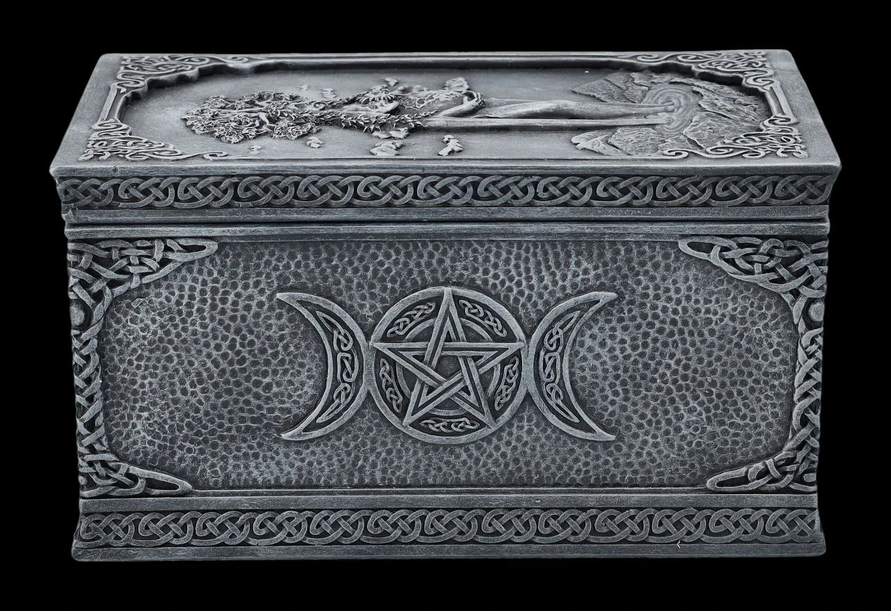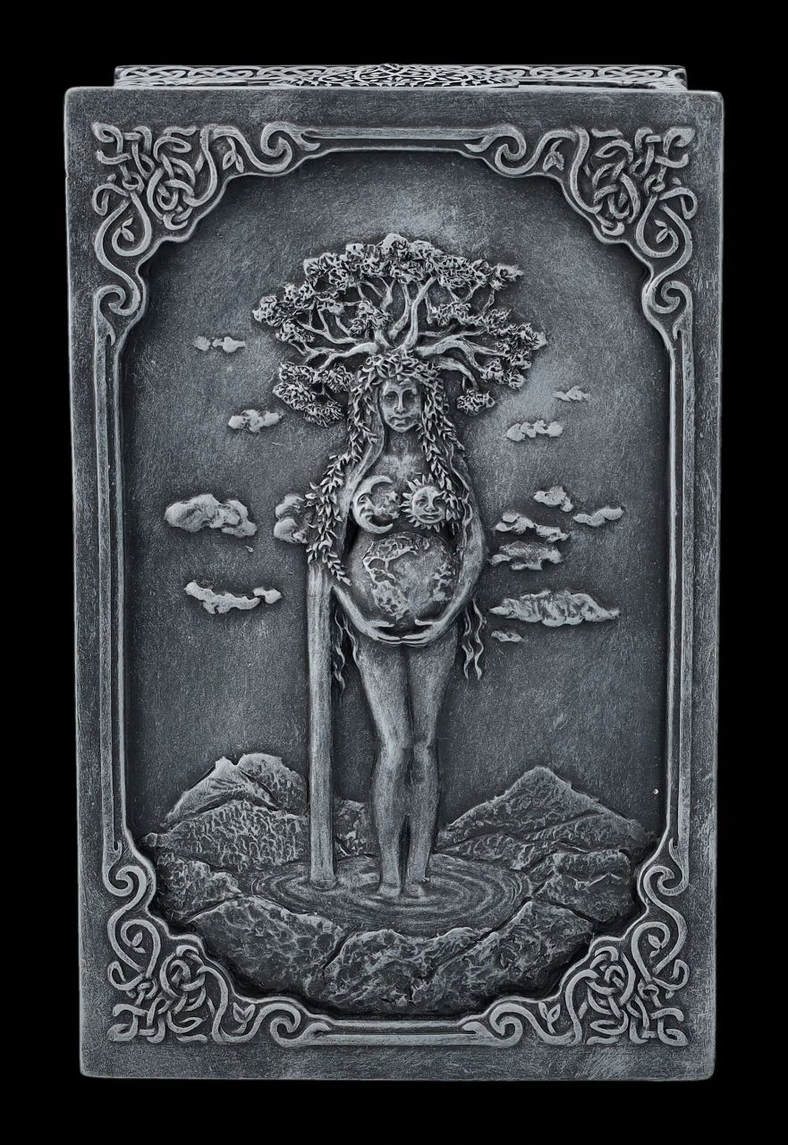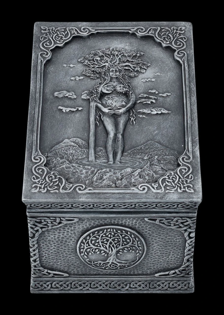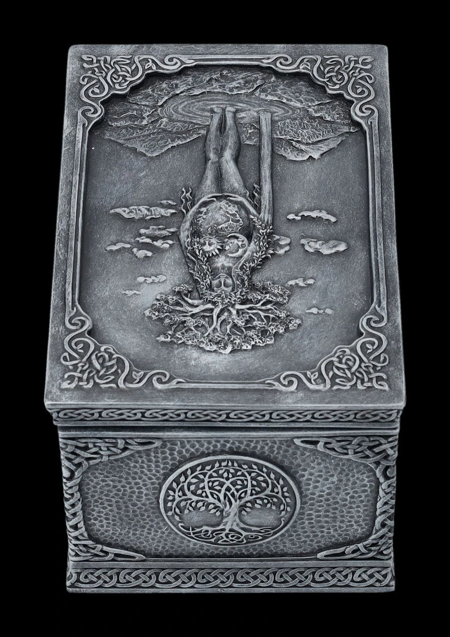 Ob nun in dieser magischen Schatulle aus der Studio Collection von Veronese die Tarotkarten, besonderer Schmuck, magische Kräuter oder kleine Geheimnisse aufbewahrt werden, bleibt jedem selbst überlassen, denn diese fantastische Wicca-Schatulle ist für alles geeignet. Auf dem Deckel der wunderbaren Schatulle ist kunstvoll Mutter Erde mit allen Wicca-Symbolen und dem Lebensbaum auf dem Kopf dargestellt. Mutter Erde scheint in einem Gebirgssee zu stehen und bis zum Himmel zu wachsen. Die herrliche handbemalte und verzierte Schatulle aus Kunststein (Polyresin) ist 8 cm hoch, 9,5 cm breit und 15 cm tief. Innen hat sie mit H: 5,5 cm / B: 7,5 cm / T: 13 cm Platz für allerlei Kleinigkeiten und ist – nicht nur für Magier und Magierinnen – auch ein fantasievolles Geschenk.