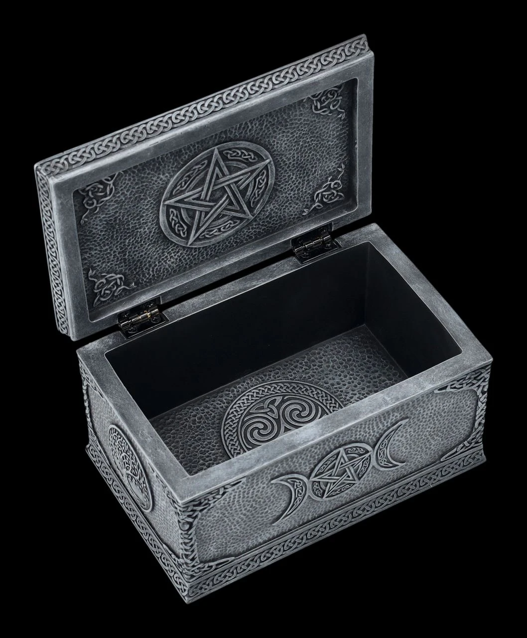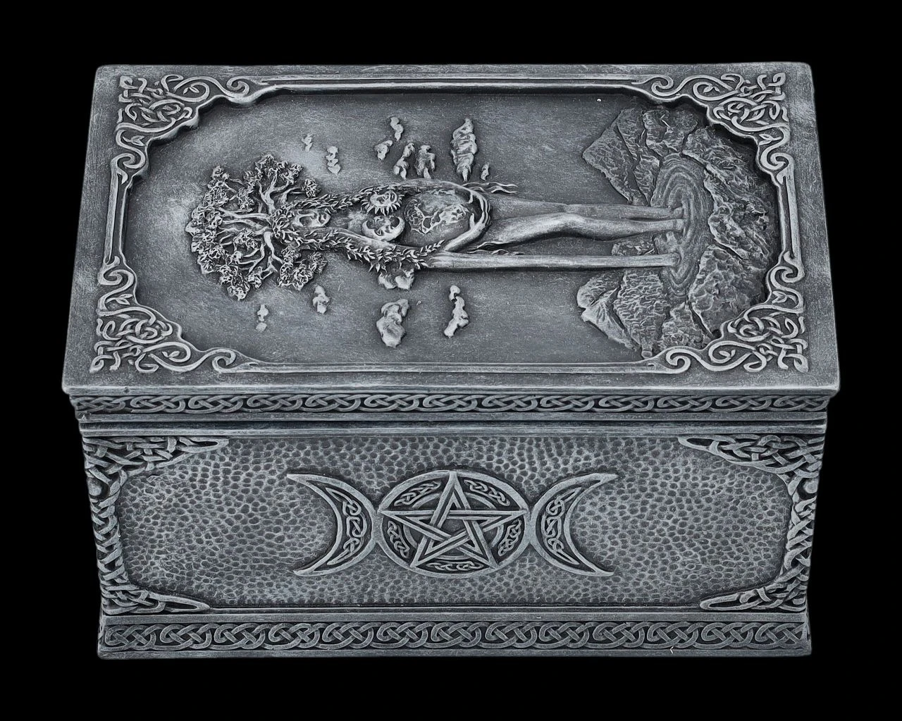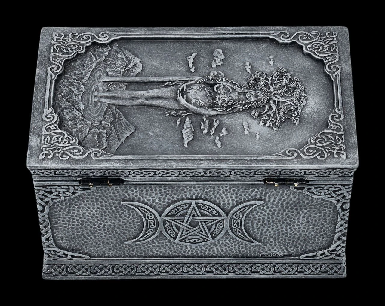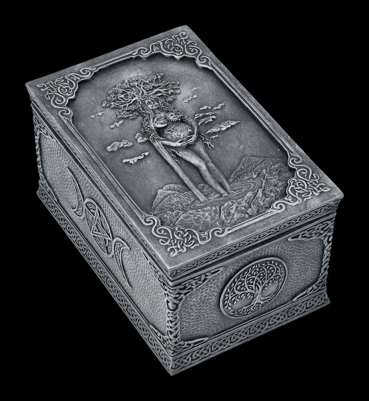 Ob nun in dieser magischen Schatulle aus der Studio Collection von Veronese die Tarotkarten, besonderer Schmuck, magische Kräuter oder kleine Geheimnisse aufbewahrt werden, bleibt jedem selbst überlassen, denn diese fantastische Wicca-Schatulle ist für alles geeignet. Auf dem Deckel der wunderbaren Schatulle ist kunstvoll Mutter Erde mit allen Wicca-Symbolen und dem Lebensbaum auf dem Kopf dargestellt. Mutter Erde scheint in einem Gebirgssee zu stehen und bis zum Himmel zu wachsen. Die herrliche handbemalte und verzierte Schatulle aus Kunststein (Polyresin) ist 8 cm hoch, 9,5 cm breit und 15 cm tief. Innen hat sie mit H: 5,5 cm / B: 7,5 cm / T: 13 cm Platz für allerlei Kleinigkeiten und ist – nicht nur für Magier und Magierinnen – auch ein fantasievolles Geschenk.