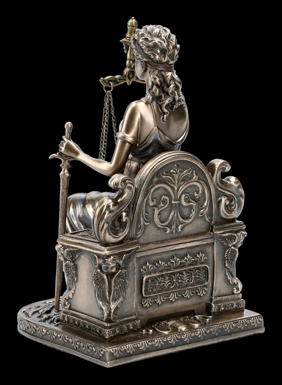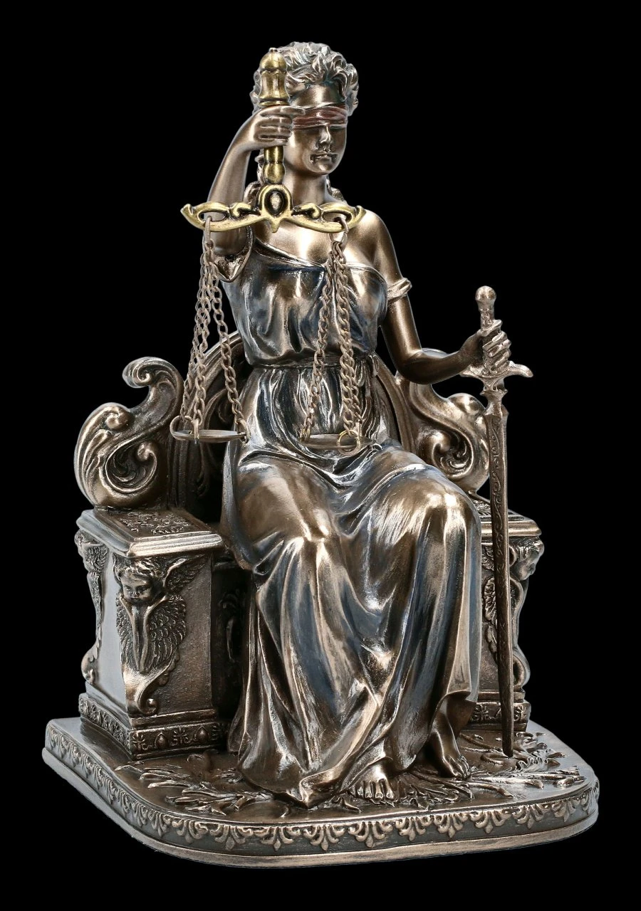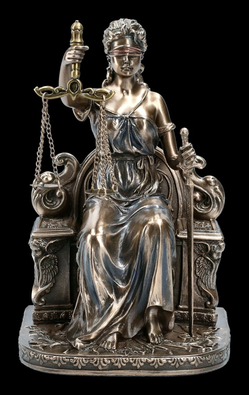 Römische Göttin der Gerechtigkeit. Im Griechischen genannt Dike. Darstellung mit Waage (Abwägen der Sachlage), dem Richtschwert (durchführen der Entscheidung) und der Augenbinde (Unvoreingenommenheit)