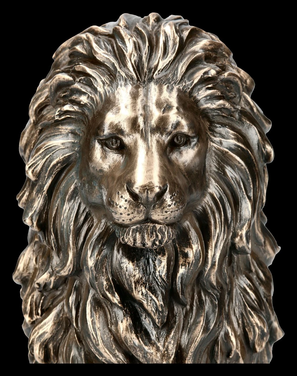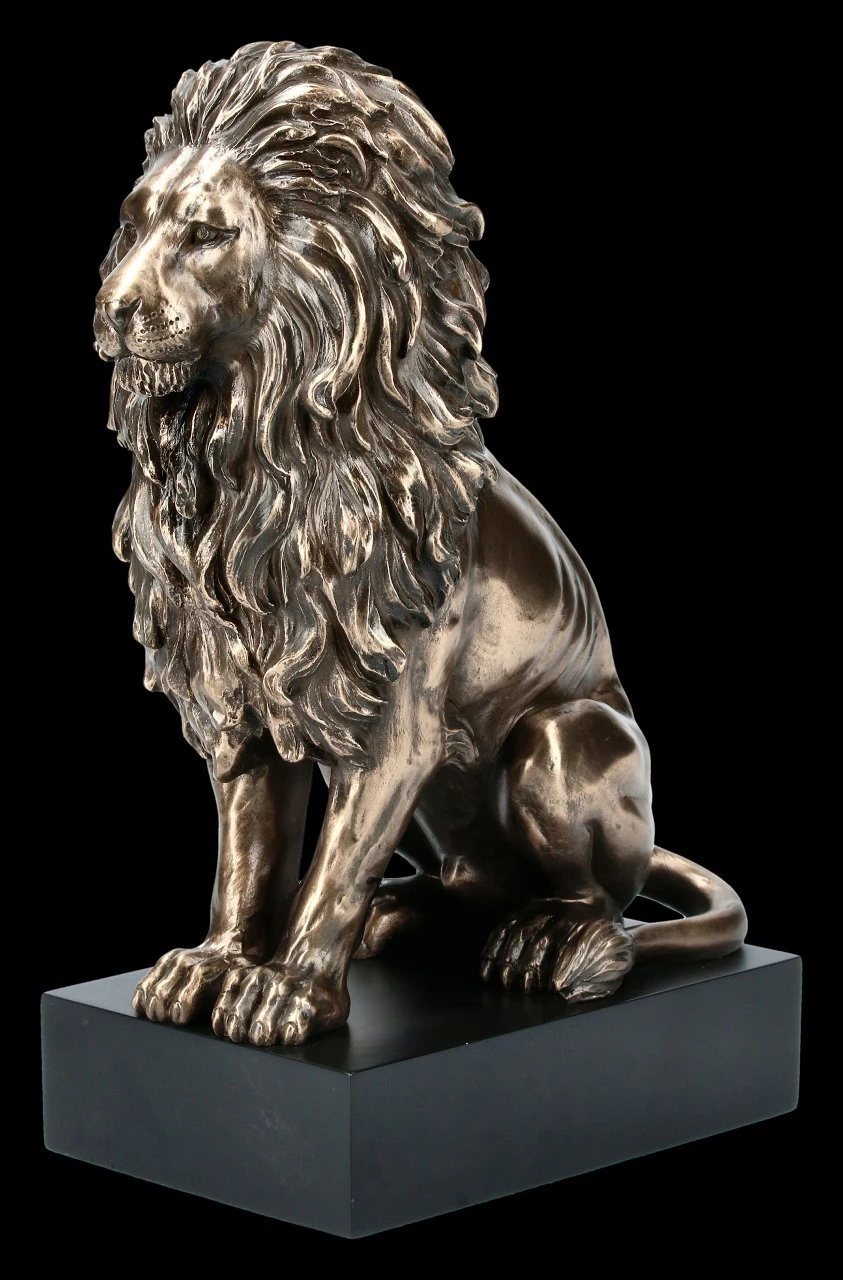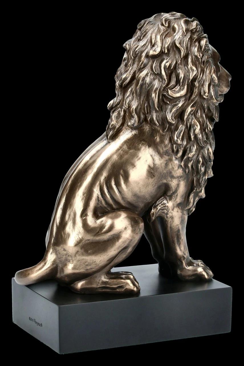 Stolz sitzt der majestätische Löwe auf einem schwarzen Monolithen und blickt mit seinen scharfen Augen in die Ferne. Durch die wunderbar genaue Ausarbeitung wirkt der Löwe lebendig und es wirkt, als ob er sich gleich bewegt.