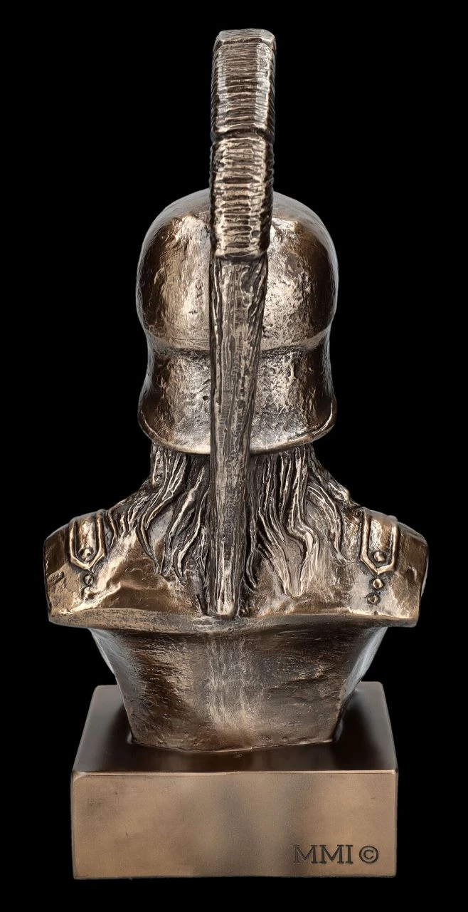 Aus edel bronziertem, hochwertigem Kunststein (Polyresin) ist die beeindruckende und ausdrucksstarke Büste eines Spartaners in der Hoplitenrüstung mit Helm von Veronese. Sparta war Jahrhunderte lang die mächtigste Militärmacht im antiken Griechenland. Neben dem berühmten Helm mit dem Kamm aus gefärbtem Rosshaar gehörten auch Brustpanzer, Beinschienen und das Schild zur Ausrüstung eines Spartaners. Die Kosten der aufwändigen Ausrüstung mussten die Krieger jedoch selbst übernehmen. Die 31 cm hohe, 14,5 cm breite und 13 cm tiefe beeindruckende Büste ist der Statue des spartanischen Königs und Kriegers Leonidas nachgebildet und wirkt durch die zurückhaltende Gestaltung ausgesprochen edel. Sie ist ein herrliches Geschenk für alle, die sich für das antike Griechenland interessieren.