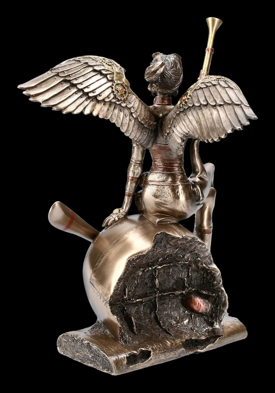 Der Technik des Steampunks sind keine Grenzen gesetzt. Diese junge Dame hat sich den lang ersehnten Traum des Fliegens erfüllt. Ihre mechanischen Flügel funktionieren endlich nach jahrelanger Arbeit. Nun muss sie die Erfindung jedoch vor den Neidern verteidigen – Ihr Gewehr ist daher stets griffbereit. Diese wunderbar detailreiche Steampunk Figur von Veronese aus der Serie Studio Collection wurde bronziert und coloriert.