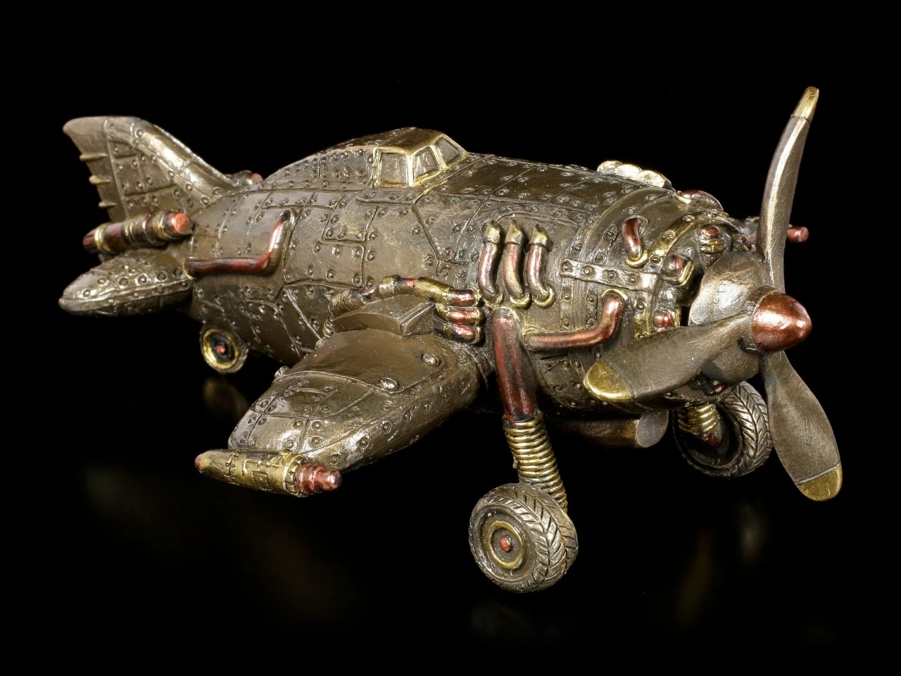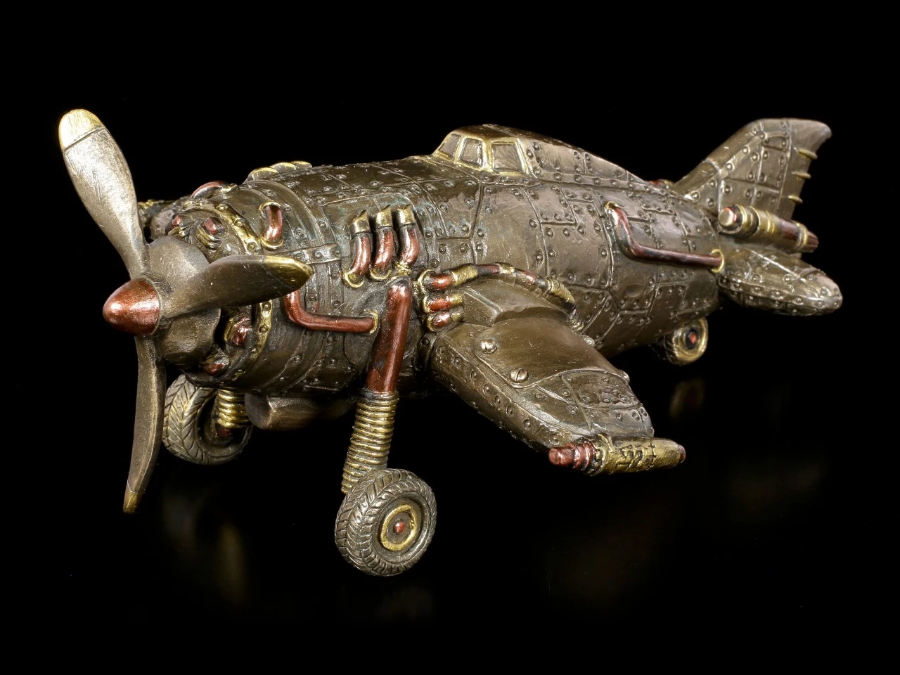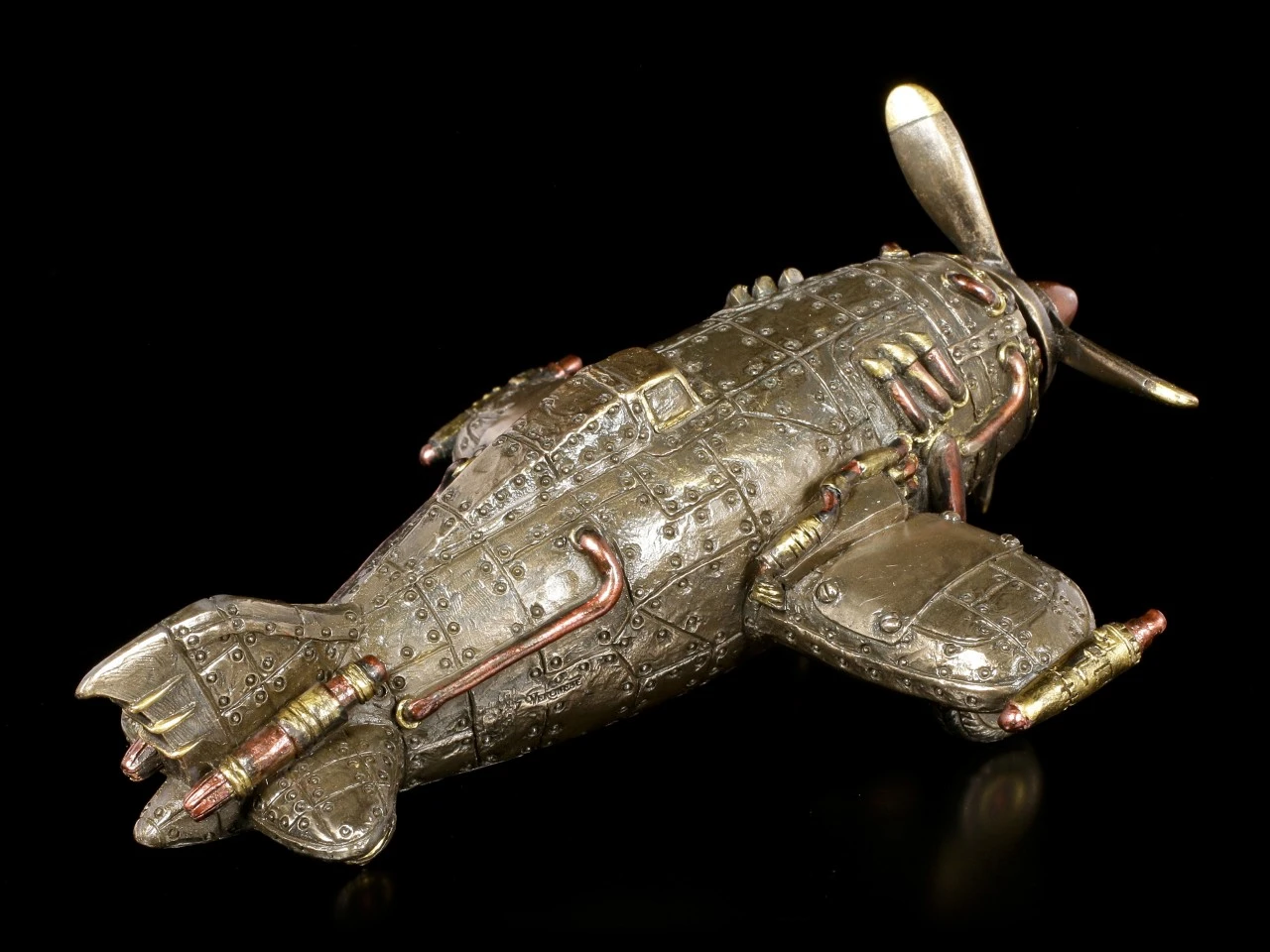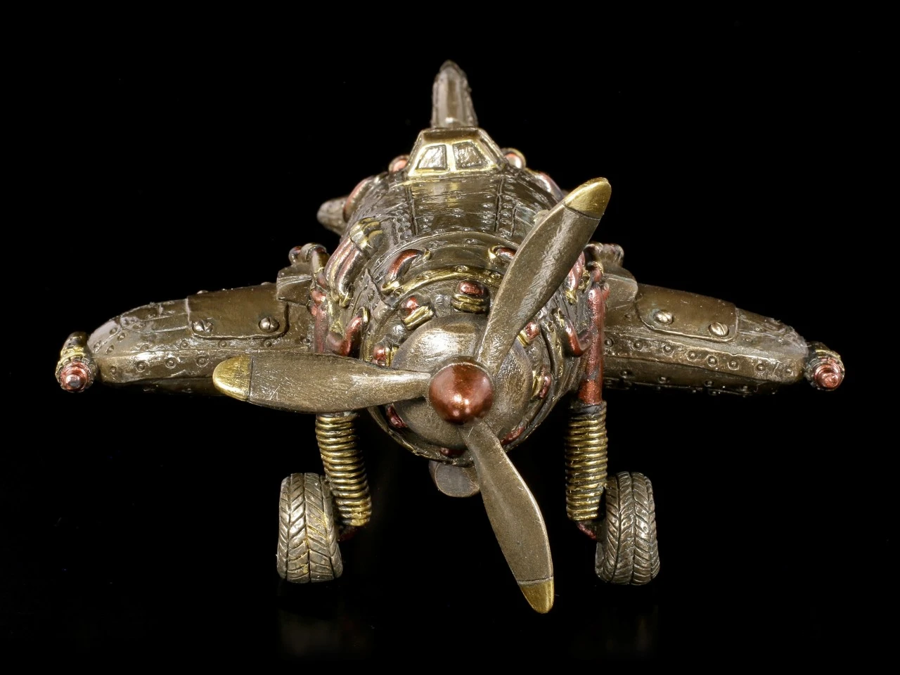 Ein perfektes Propellerflugzeug für einen wahren Steampunk Enthusiasten! Der Propeller lässt sich drehen und so wirkt das Flugzeug, als ob es gleich abheben wird. Der erfrischende retro-futurismus des Steampunks lässt das bronzierte und colorierte Flugzeug von Veronese zum Blickpunkt in der Wohnung werden. Es wurde äußerst detailreich aus Kunststein (Polyresin) gefertigt.