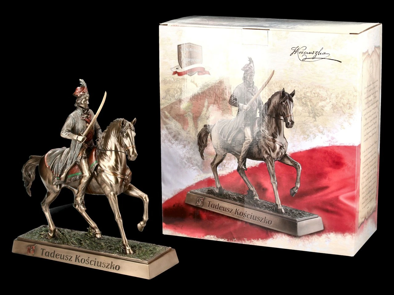 Außerordentlich detailreich und sehr edel bronziert und coloriert zeigt diese fantastische Figur von Veronese den polnischer Ingenieur Andrzej Tadeusz Bonawentura Kościuszko, der als Anführer im Russisch-Polnischen Krieg von 1792 zum polnischen Nationalhelden wurde. Die effektvolle Reiter-Figur sitzt mit gezogenem Schwert auf seinem wunderbar dargestellten Pferd. Auf dem Podest ist der Name Tadeusz Kościuszko zu lesen. Die prachtvolle Reiterstatuette ist 27 cm hoch, 25 cm breit und 8 cm tief. Sie ist nicht nur eine auffallende Deko, sondern auch ein tolles Geschenk für alle Bewunderer des Nationalhelden und wird inklusive Geschenkverpackung verschickt.