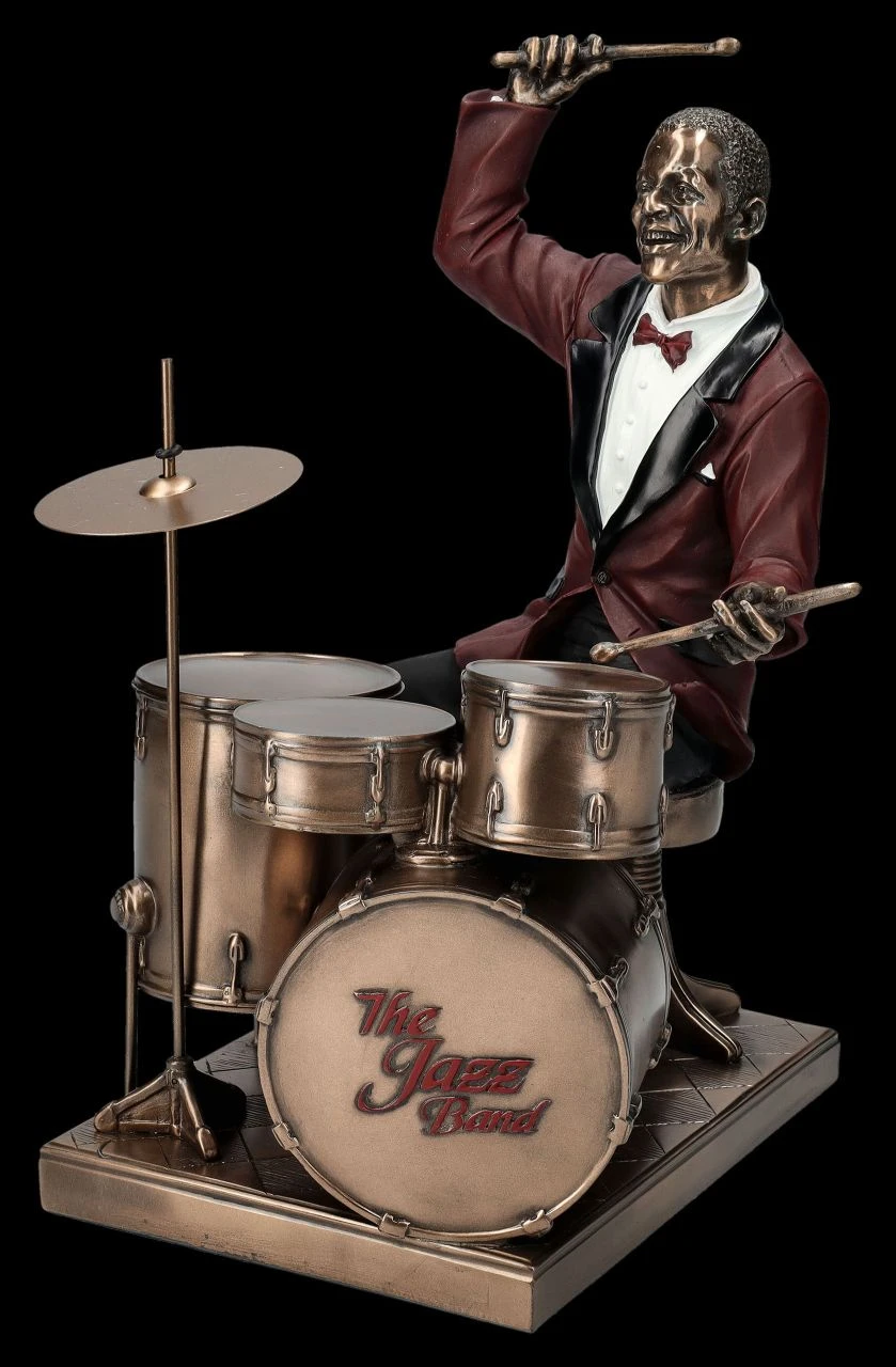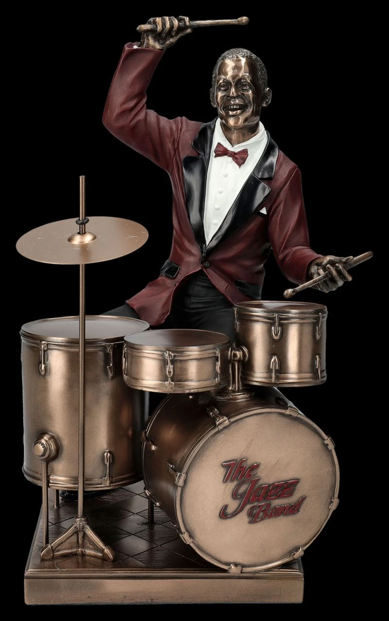 Die Jazz Band Figur eines Schlagzeugers aus der Studio Collection von Veronese ist in seiner ganzen Leidenschaft einfach perfekt dargestellt. Von der roten Smokingjacke mit samtschwarzen Aufschlägen, dem weißen Hemd mit roter Fliege, der schwarzen eleganten Hose bis zu den glänzend schwarzen Schuhen ist dieser von seinem Rhythmus begeisterte und fröhlich lachende Schlagzeuger an seinem Instrument von Veronese in seiner ganzen Erscheinung wunderbar eingefangen. Die edel bronzierte, 26,5 cm hohe, 18 cm breite und 17 cm tiefe Jazz Band Figur des Schlagzeugers wurde aus hochwertigem Kunststein (Polyresin) gefertigt und sorgsam mit viel Liebe zum Detail coloriert. Für einen Jazz-Musiker, aber auch für begeisterte Fans berühmter Jazz-Schlagzeuger – von Elvin Jones, Art Blakey bis zu all den anderen Berühmtheiten – ist dieser leidenschaftliche Schlagzeuger das perfekte Geschenk. Mit den anderen Jazz Band Figuren aus unserem Shop, wie dem Saxophonisten, oder auch der wunderbaren Jazz-Sängerin, sind diese Jazz-Band-Figuren eine wunderbare Reminiszenz an die Großen des Jazz.