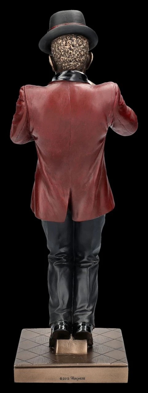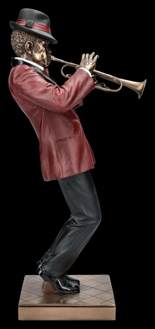Ob Swinging Blues oder New Orleans Dixie – man hört beinahe die leidenschaftlichen Töne aus dem Instrument dieses Jazz Trompeters. In dunkelroter Smoking-Jacke mit schwarzen Aufschlägen, roter Fliege, schwarzer Hose und den typischen ‚Pork Pie‘-Hut auf dem Kopf, wirkt der Jazz-Trompeter sehr realistisch. Die 30,5 cm hohe, 10,5 cm breite und 14 cm tiefe Jazz Band-Figur aus edel bronziertem und wunderbar coloriertem Kunststein (Polyresin) stammt aus der Studio Collection von Veronese und wirkt in ihrer Darstellung wie aus einem alten Film. Der Trompeter ist – vielleicht auch mit den anderen Jazz-Band-Figuren aus unserem Shop – nicht nur eine perfekte Deko für ein Jazz-Lokal, sondern auch ein tolles Geschenk für einen Trompeter.