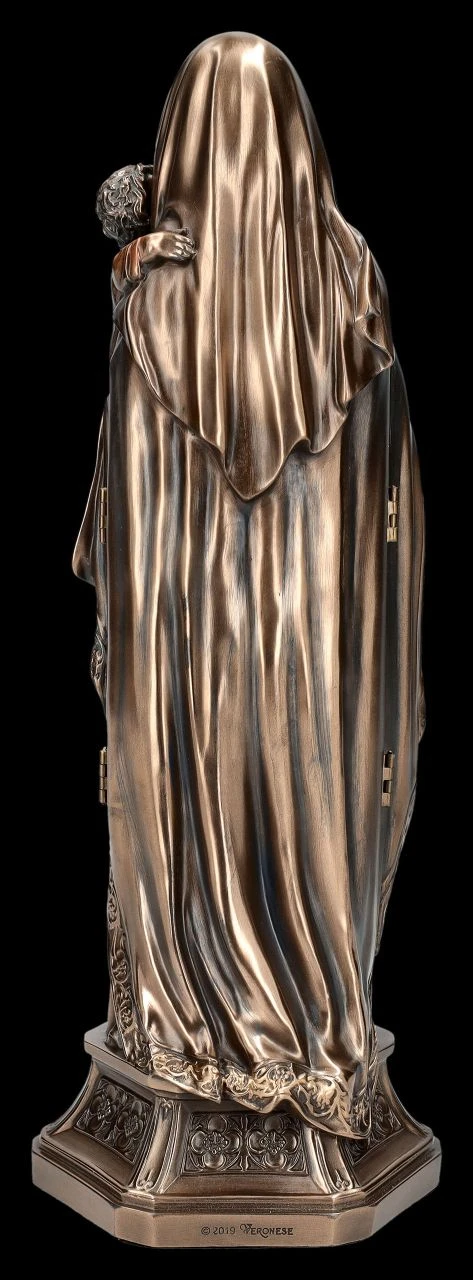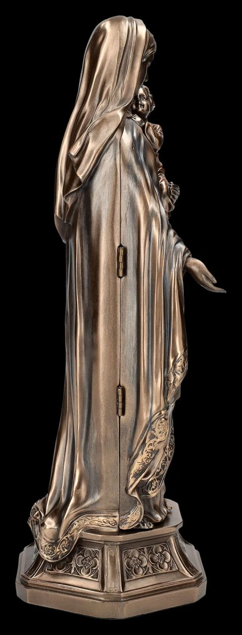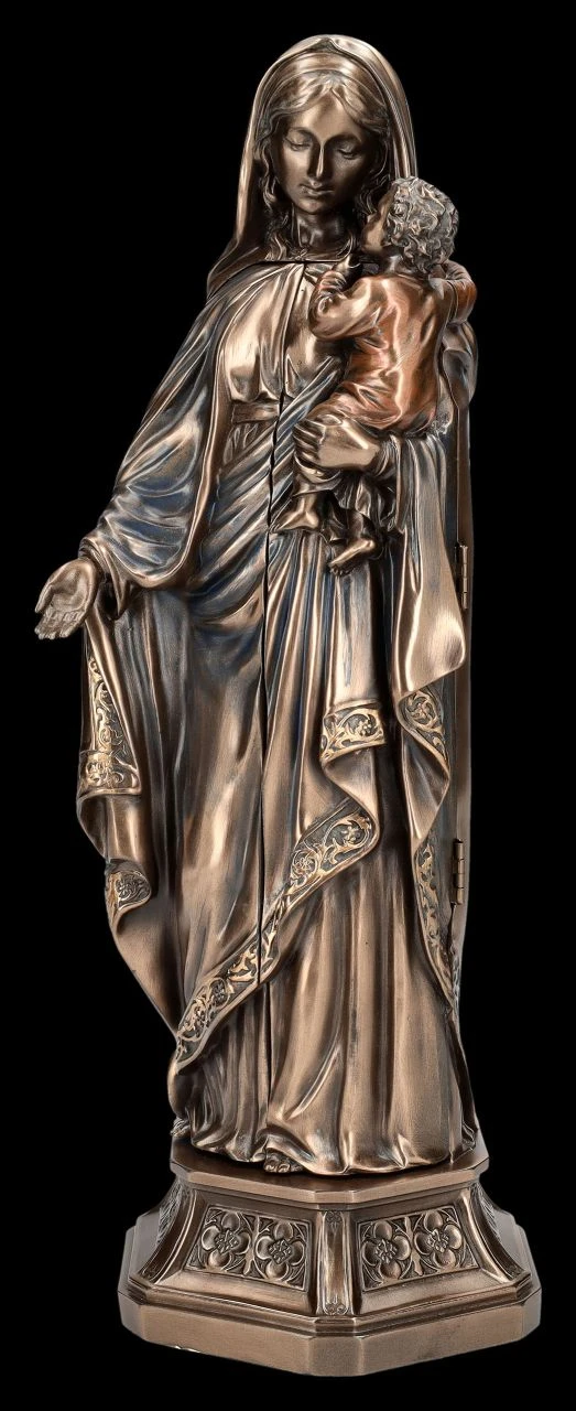 Öffnet man diese wunderschöne, 28,5 cm hohe, 10,5 cm breite und 10 cm tiefe Figur von Maria mit dem Jesuskind auf dem Arm, dann entsteht ein 14,5 cm breiter Flügelaltar. In dem Triptychon ist in der Mitte die Szene von Jesus Geburt im Stall zu Bethlehem zu sehen. Begleitet wird die Szene durch den Besuch der Heiligen drei Könige auf der rechten Seite und einem Hirten mit Schafen auf der linken Seite. Der Flügelaltar mit Maria Lady of Grace ist wunderbar detailreich aus hochwertigem und edel bronziertem Kunststein (Polyresin) gefertigt und wurde sehr schön und zurückhaltend coloriert. Der Triptychon Flügelaltar stammt aus der Studio Collection von Veronese und ist eine bezaubernde Darstellung für einen Altar. Aber auch statt einer Krippe zu Weihnachten ist diese herrliche Marien-Statue ein perfektes Geschenk.