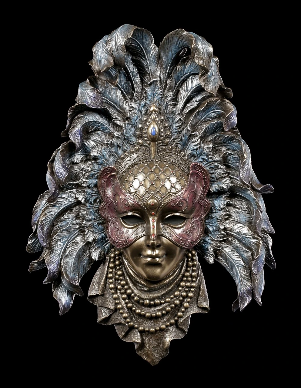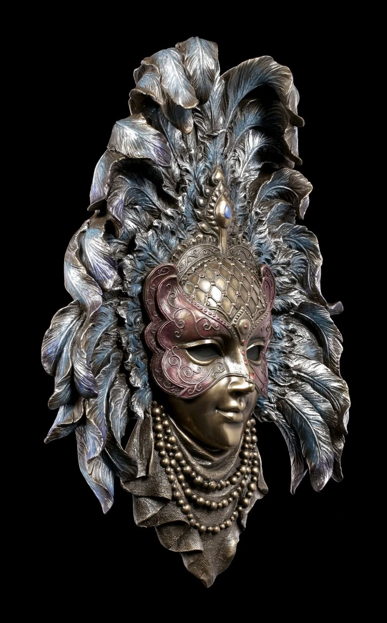 Das Wandrelief von Veronese ist im Stil einer venezianischen Maske gestaltet worden. Die wundervollen ausgearbeiteten Details macht die Maske zu einer tollen Wanddeko. Die bronzierte und colorierte Maske Feathers aus Kunststein (Polyresin) ist von einem ausschweifenden Kranz aus Federn umrahmt.