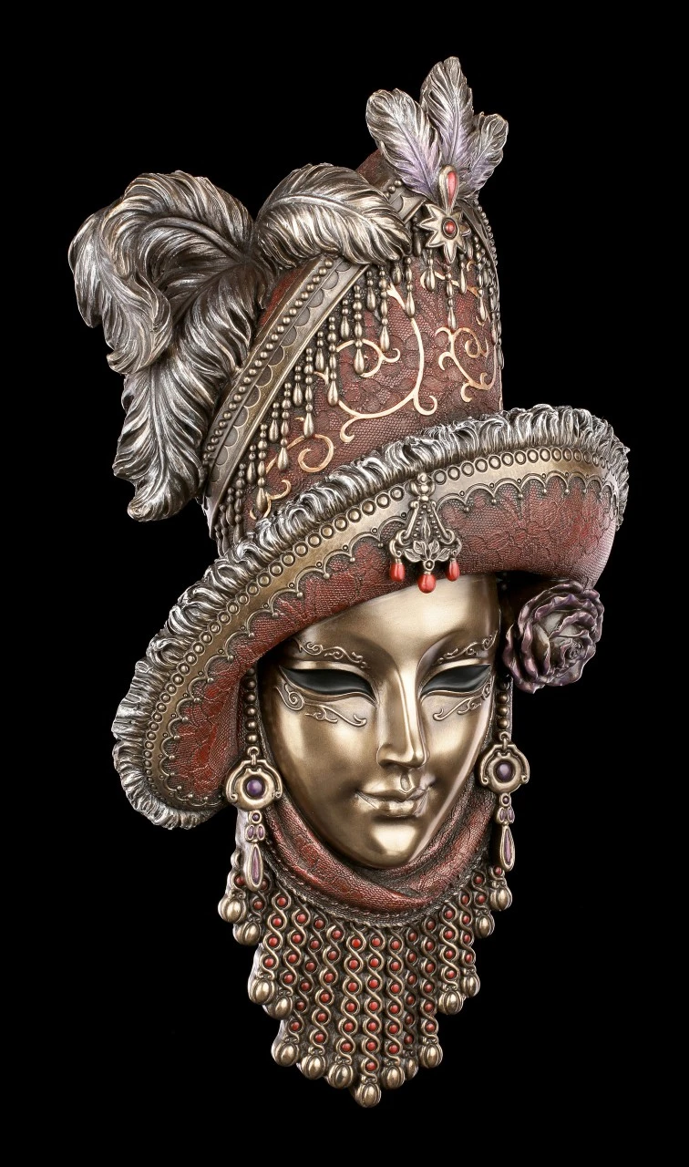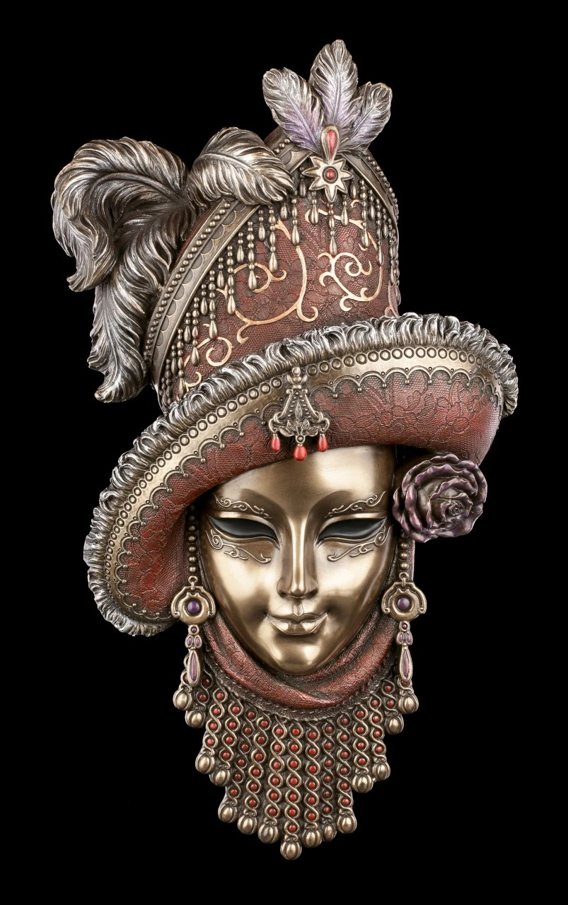 Bringen Sie ein wenig der romantischen venizianischen Karnevals in Ihre Wohnung. Die filigrane und elegante bronzierte und kolorierte Maske von Veronese wird zum stilvollen Blickfang an Ihrer Wand.