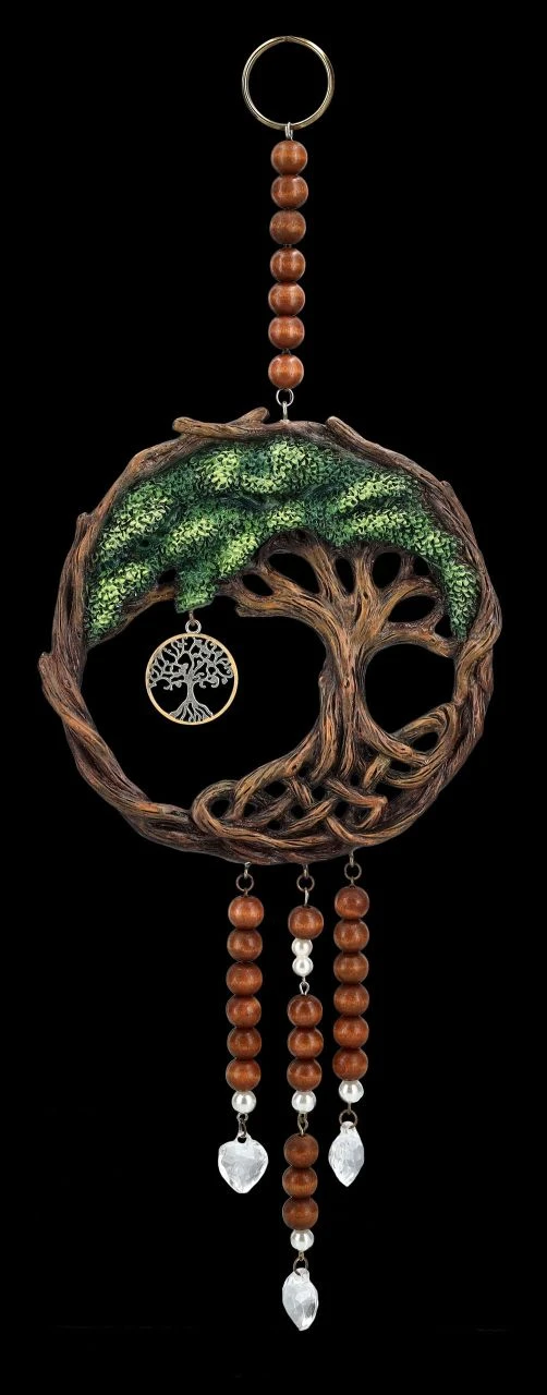 Die Wanddeko mit dem Lebensbaum im Zentrum ist ein wunderschöner Traumfänger aus der Studio Collection von Veronese. Der Lebensbaum ist in zahlreichen Kulturen und Religionen ein uraltes mythisches Symbol für Wachstum, Fruchtbarkeit, Unsterblichkeit und damit für das Wiedererwachen in der Natur. Die Wurzeln des Lebensbaums bei diesem herrlichen Traumfänger bilden einen Kreis, der sich über der Baumkrone schließt. In den Zweigen des Baums hängt ein Medaillon, das wiederum den Lebensbaum zeigt. Der 35 cm hohe, 13 cm breite und 2 cm tiefe Traumfänger mit dem Lebensbaum aus bronzierten und schön coloriertem Kunststein (Polyresin) hängt an einer mit Holzperlen verzierten Metallkette. Als Zeichen der Hoffnung für ein gutes Wachstum und damit für eine glückliche Zukunft ist dieser schöne Traumfänger mit dem Lebensbaum auch ein wunderbares Geschenk
