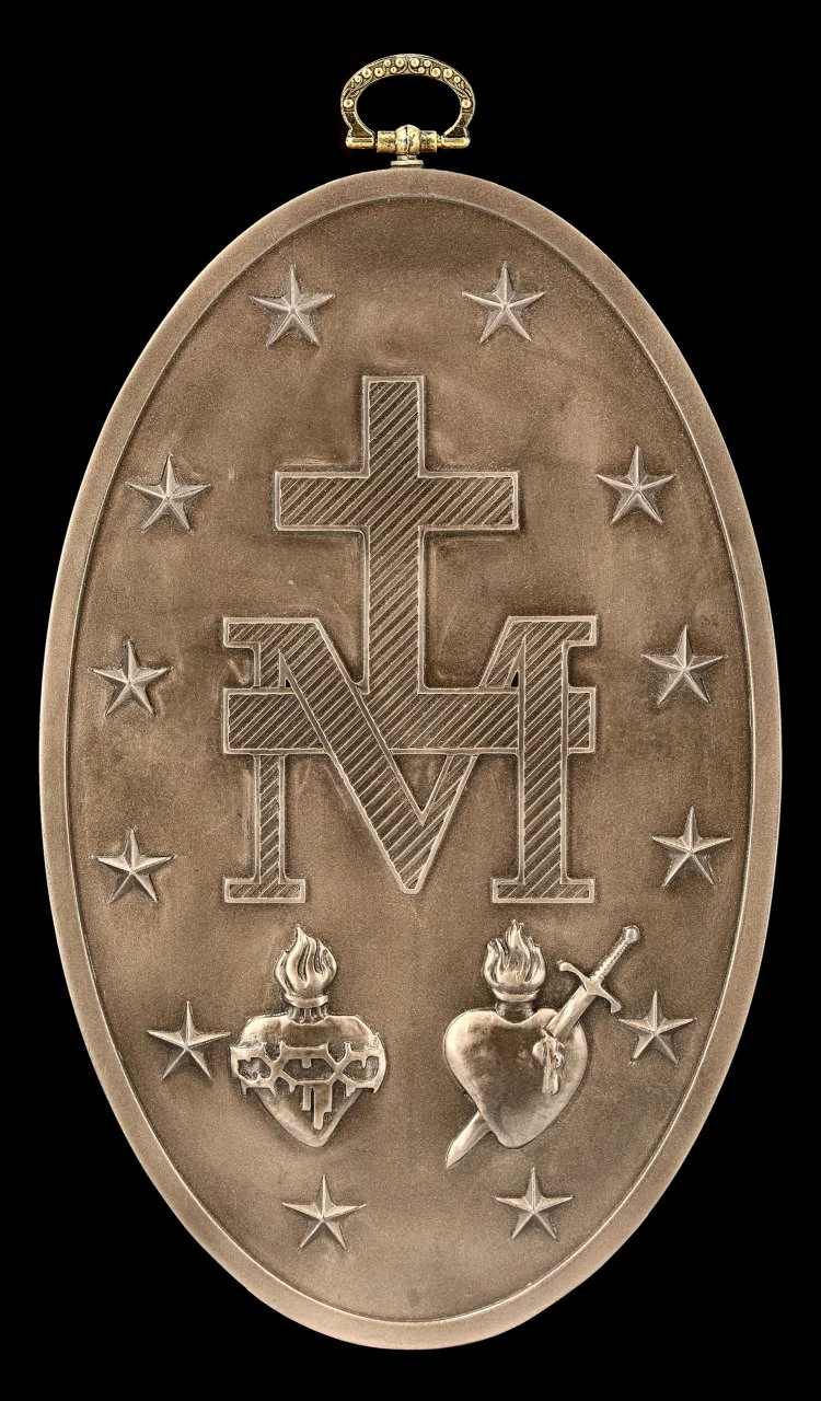 Dieses wunderbare Wandrelief mit der Maria Mutter Gottes ist wie ein Medaillon gearbeitet. In der Umrandung der schönen Madonna im blauen Umhang, mit Heiligenschein und sehr sanftem Gesichtsausdruck steht eine Zeile des Gebetes ‚Maria ohne Sünde, bete für uns‘ in englischer Sprache. Die stilvolle Wandrelief von Veronese aus Serie The Holy Journey ist aus edel bronziertem und sehr fein coloriertem Kunststein (Polyresin) gefertigt. Es ist 20 cm hoch (mit Aufhängung: 22 cm), 12,5 cm breit und 1,5 cm tief und es ist zum Hängen.