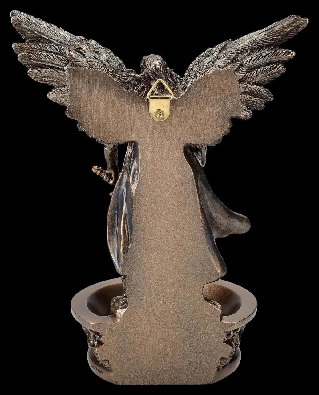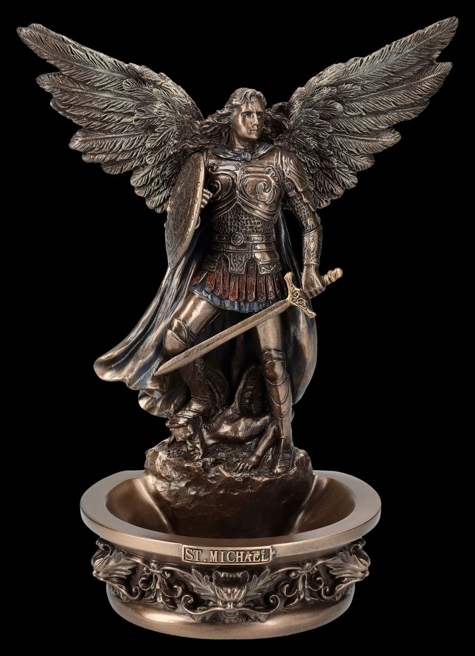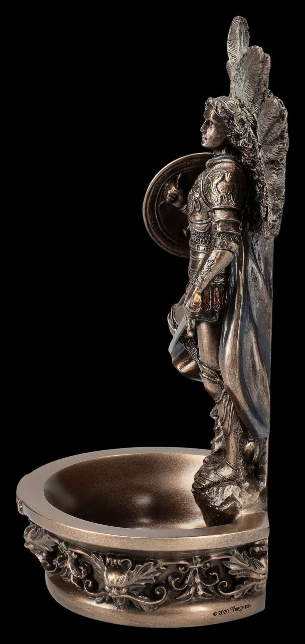 Heroisch – ausgerüstet mit Schwert und Schild – steht der Erzengel Michael mit weit ausgebreiteten Engelsflügeln am Rande dieses Weihwasserbeckens. Sein Fuß steht auf dem Kopf des Satans, den er als das Böse besiegt hat. Aus der Studio Collection von Veronese stammt dieses edel bronzierte und fein colorierte Weihwasserbecken zum Hängen und Hinstellen mit dem Erzengel Michael. Es ist detailreich aus hochwertigem Kunststein (Polyresin) gefertigt und 18,5 cm hoch, 14 cm breit und 8,5 cm tief. In dem bekannten Gebet von Papst Leo XIII heißt es u.a.:’Heiliger Erzengel Michael, schirme uns im Streite gegen die Bosheit und die Arglist des Teufels. Sei Du unser Schutz….‘ Daher ist dieses prächtige Weihwasserbecken mit dem Erzengel Michael für den persönlichen Altar oder den Besinnungsraum perfekt geeignet und damit auch ein wunderbares Geschenk.