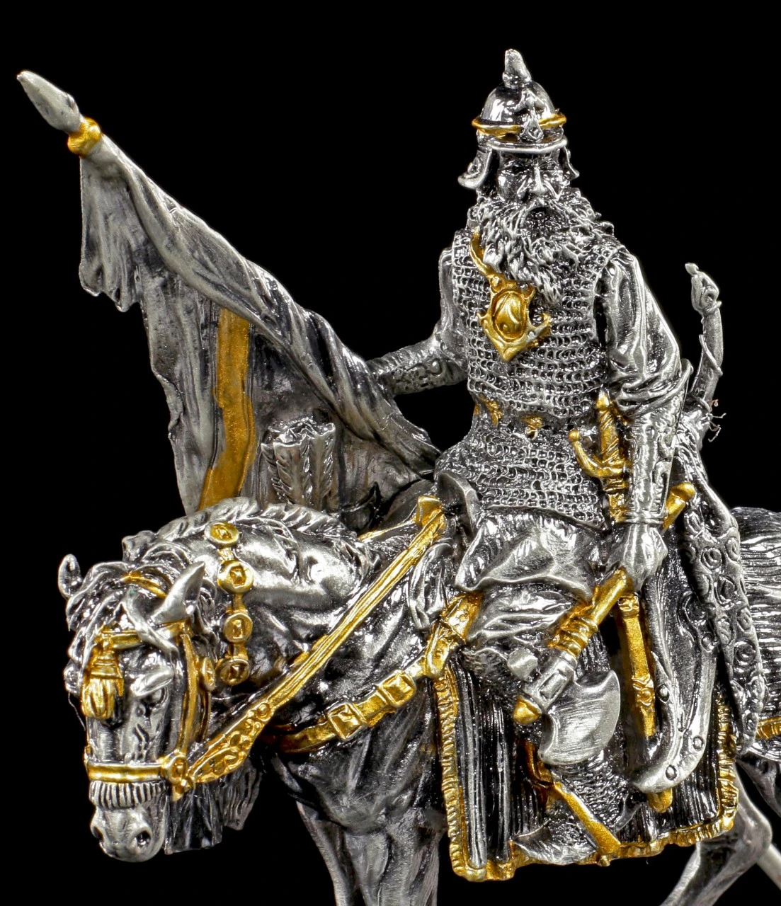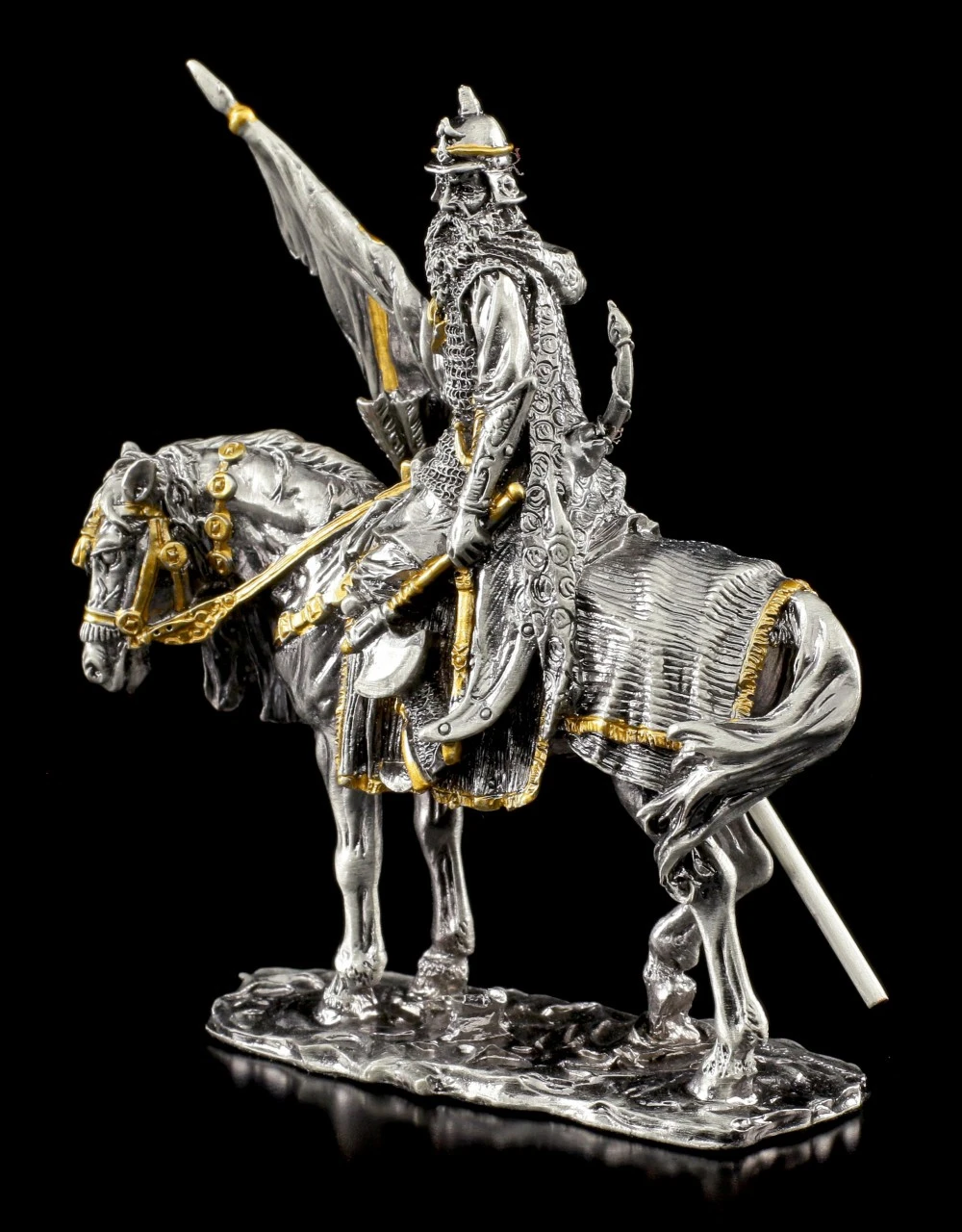 Tolle Wikinger Zinn Figur von Veronese. Der Bart, das Haar, die Flagge und auch das Pferd wurden sehr detailreich gearbeitet und die Details werden durch die goldenen Akzente noch unterstrichen. Ein tolles Geschenk für jeden Wikinger Begeisterten.