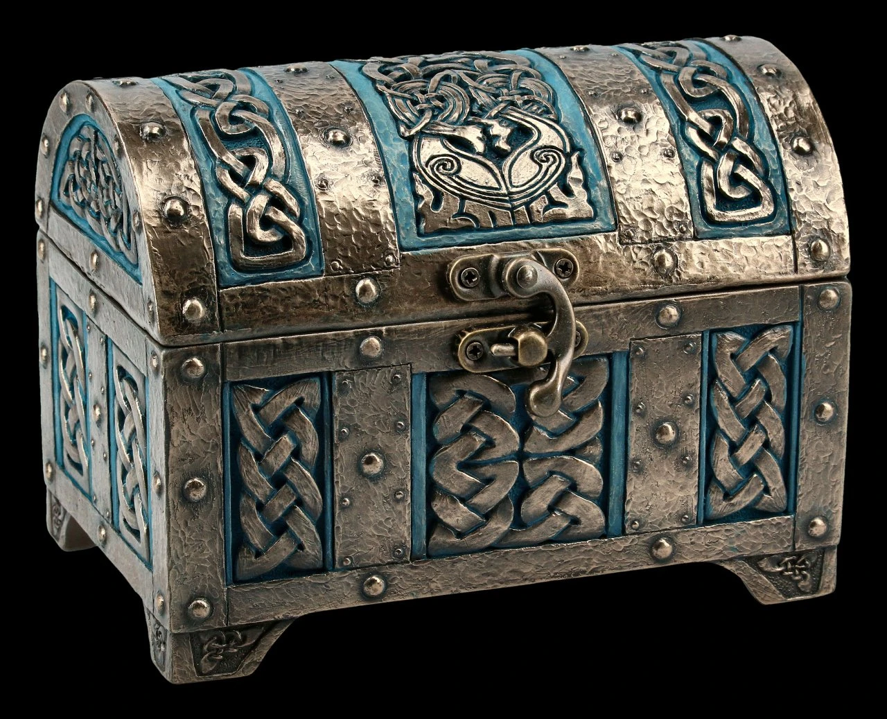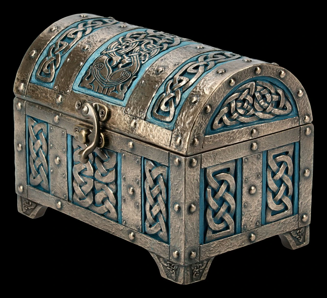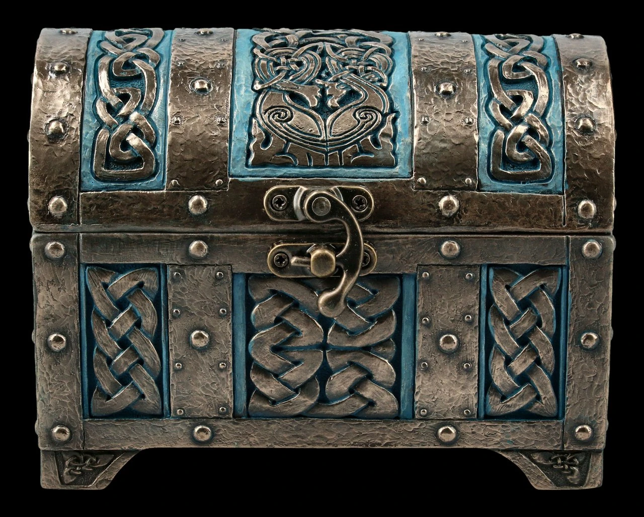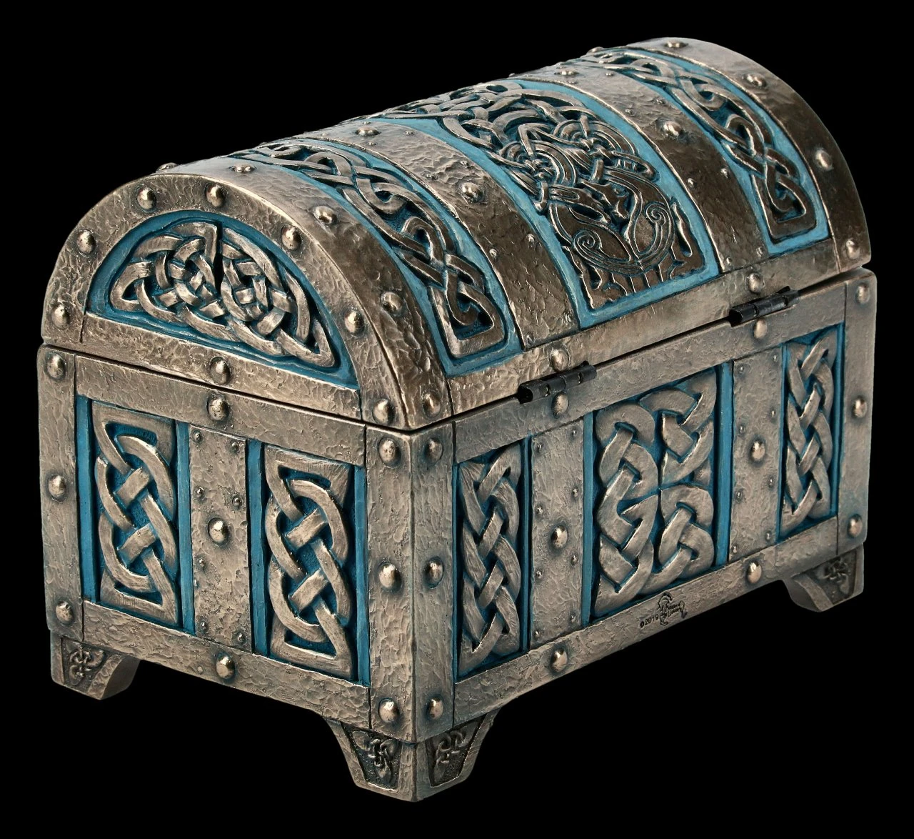 Einfach edel sieht diese reich verzierte Wikinger Schatztruhe aus der Studio Collection von Veronese aus. Die wunderschöne Schatztruhe aus Valhalla’s Vault ist sehr detailreich aus Kunststein (Polyresin) gefertigt und mit viel Aufmerksamkeit edel bronziert und coloriert. Sie hat mit ihrer Höhe von 11 cm, der Breite von 14,5 cm und der Tiefe von 10,5 cm auf jeden Fall Platz für ein paar Münzen oder ein kleines Geschmeide. Die Innenmaße sind H 5 cm / B 13 cm / T 7,5 cm. Diese schöne Schatztruhe ist auch ein tolles Geschenk für alle Wikinger.