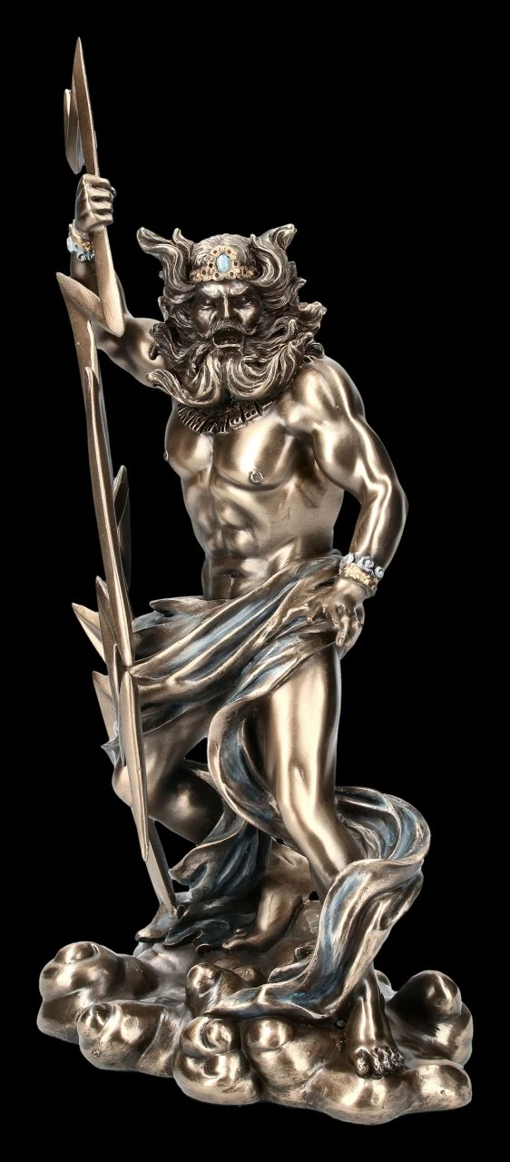 Zeus ist der oberste olympische Gott der griechischen Mythologie und mächtiger als alle griechischen Götter. Nur das personifizierte Schicksal, seine Töchter, stand über ihm. Seine Attribute sind Zepter, Adler, Blitzbündel, Helm, manchmal auch der Eichenkranz.