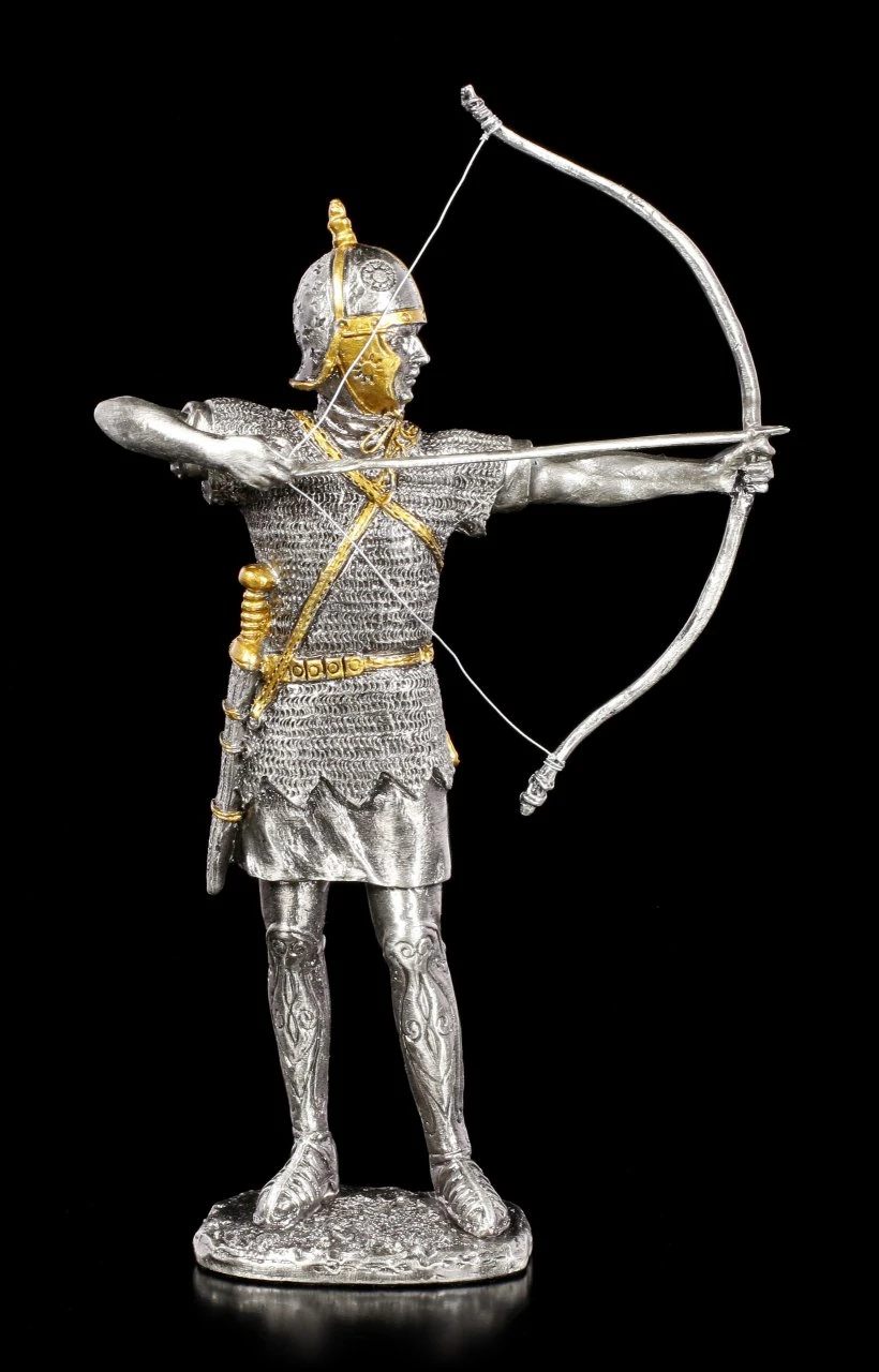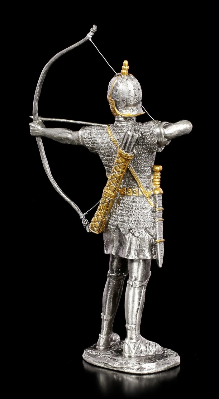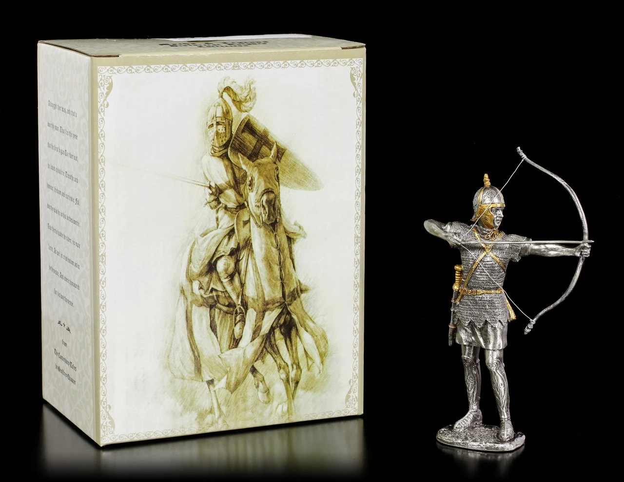 Der mittelalterliche Bogenschütze hat den Bogen angelegt und zielt in die Ferne. Sein Kettenhemd klirrt leise bei der Bewegung. Die detailreiche Zinn Figur aus dem Haus Veronese besticht durch die goldfarbenen Details und die saubere Machart.