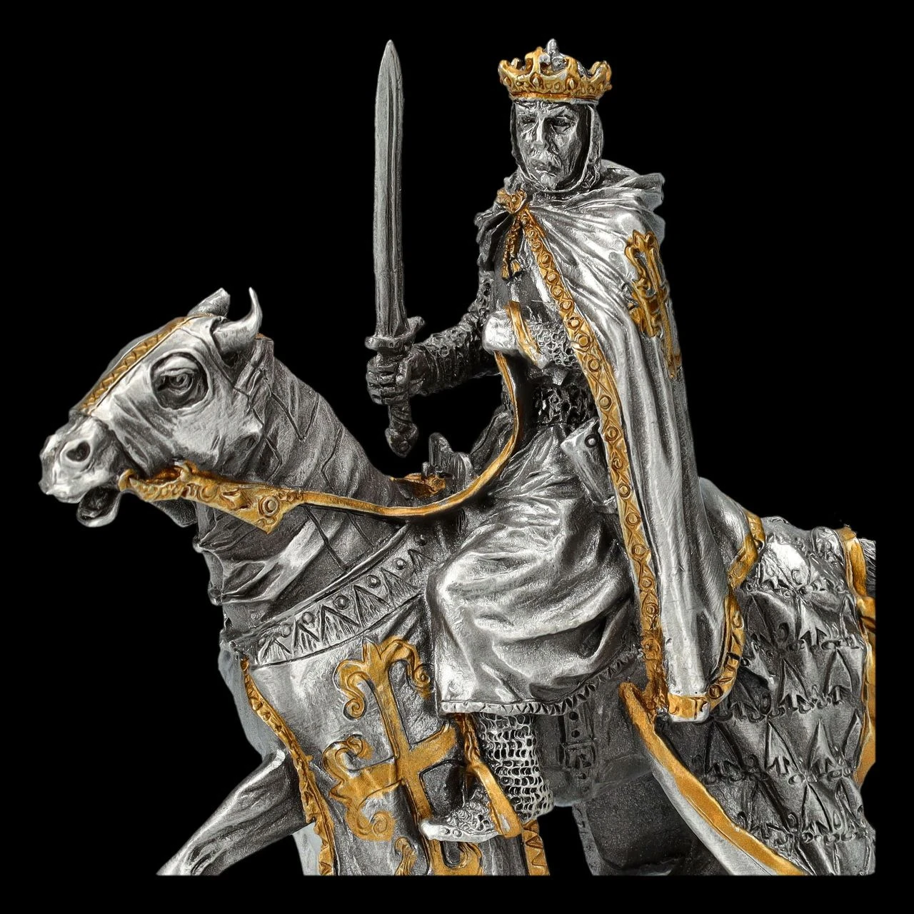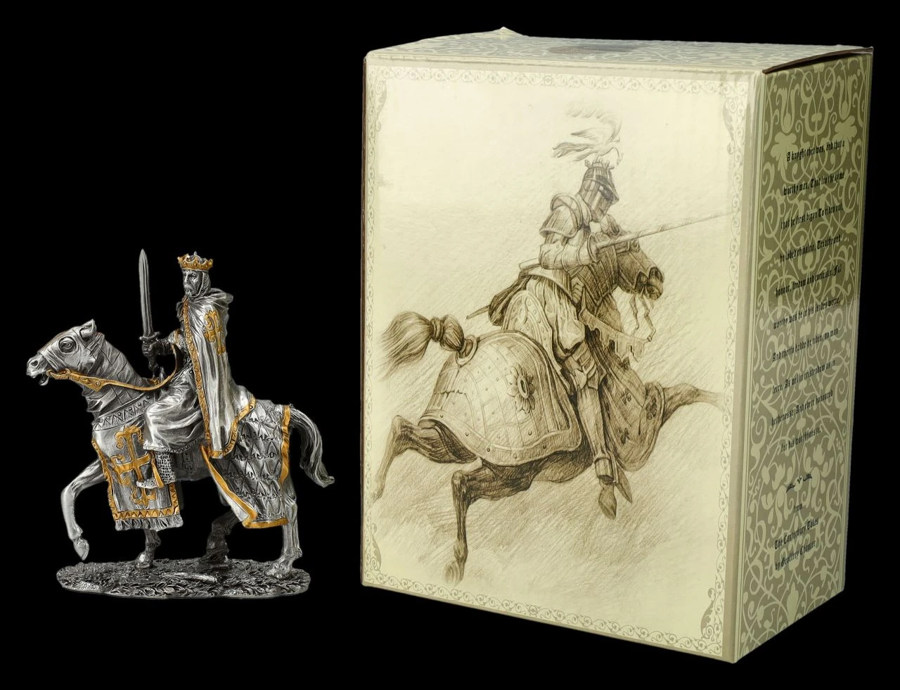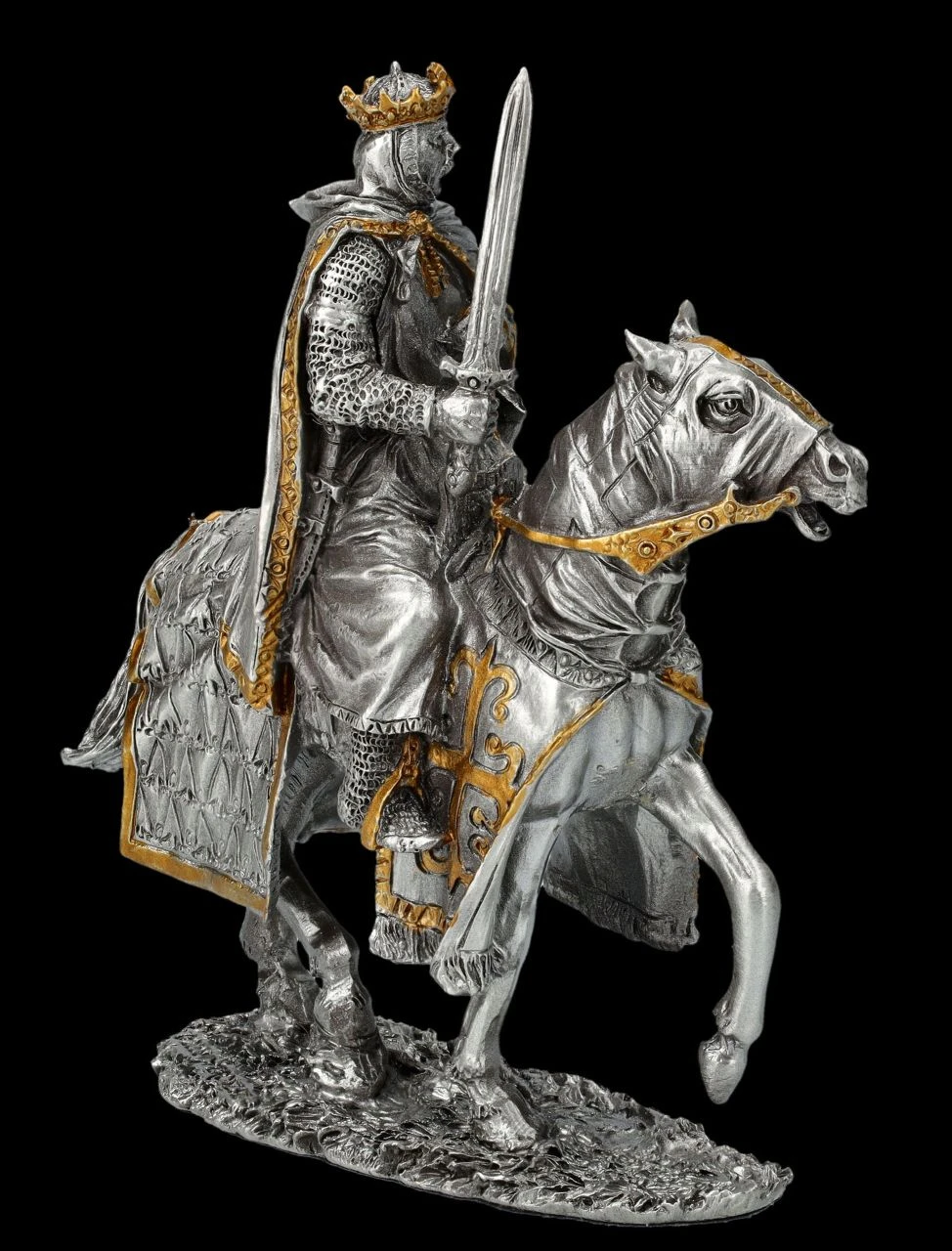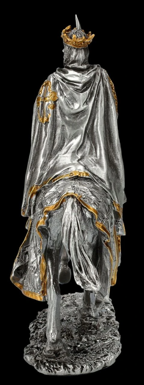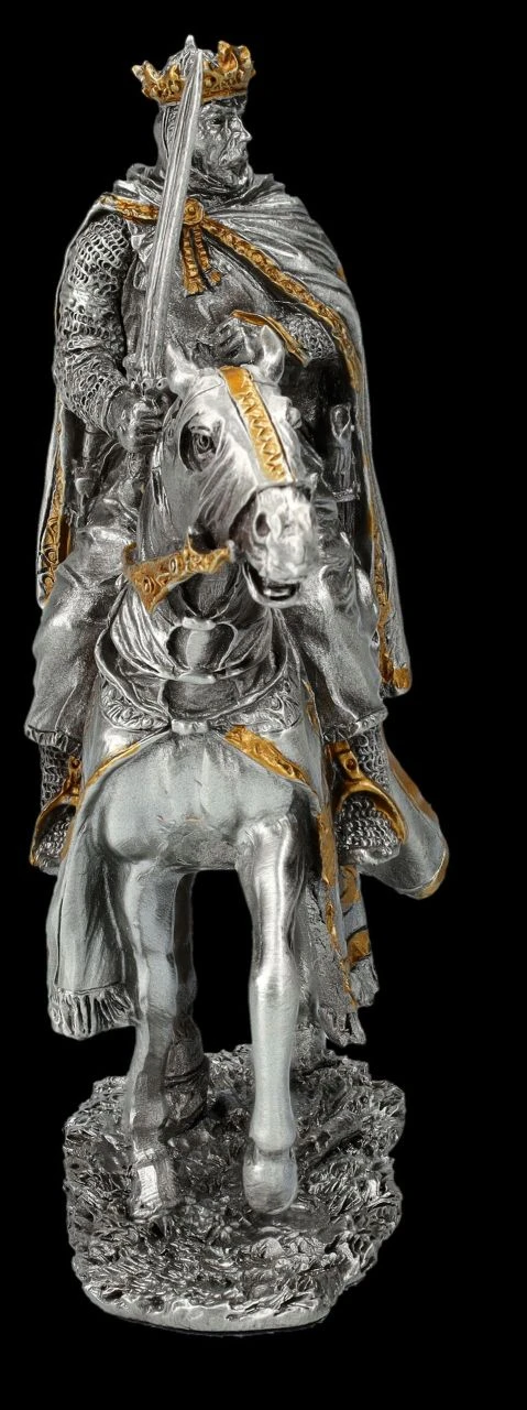 Seiner Verantwortung bewusst, sitzt der alte König mit Krone und Umhang, auf dem sein Wappen abgebildet ist, in stolzer Haltung auf seinem Pferd. Mit der linken Hand hält er locker die Zügel und mit der rechten Hand aufrecht sein Schwert. Es wirkt beinahe, als würde er alles nachdenklich überblicken, bevor er sein Zeichen zum Aufbruch gibt. Die wunderbar detailreiche Figur aus Zinn ist mit den goldenen Akzenten von Hand bemalt und wirkt ausgesprochen edel. Die 10 cm hohe, 9 cm breite und 3,5 cm tiefe Figur des Königs auf dem Pferd stammt aus der Historical Knights Collection von Veronese. Sie ist für alle Sammler ein perfektes Geschenk und kommt inklusive eines toll bedruckten Geschenkkartons.