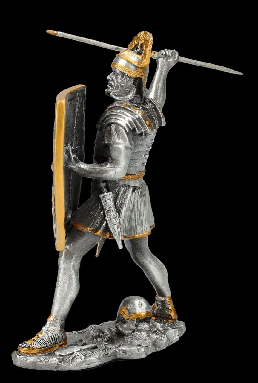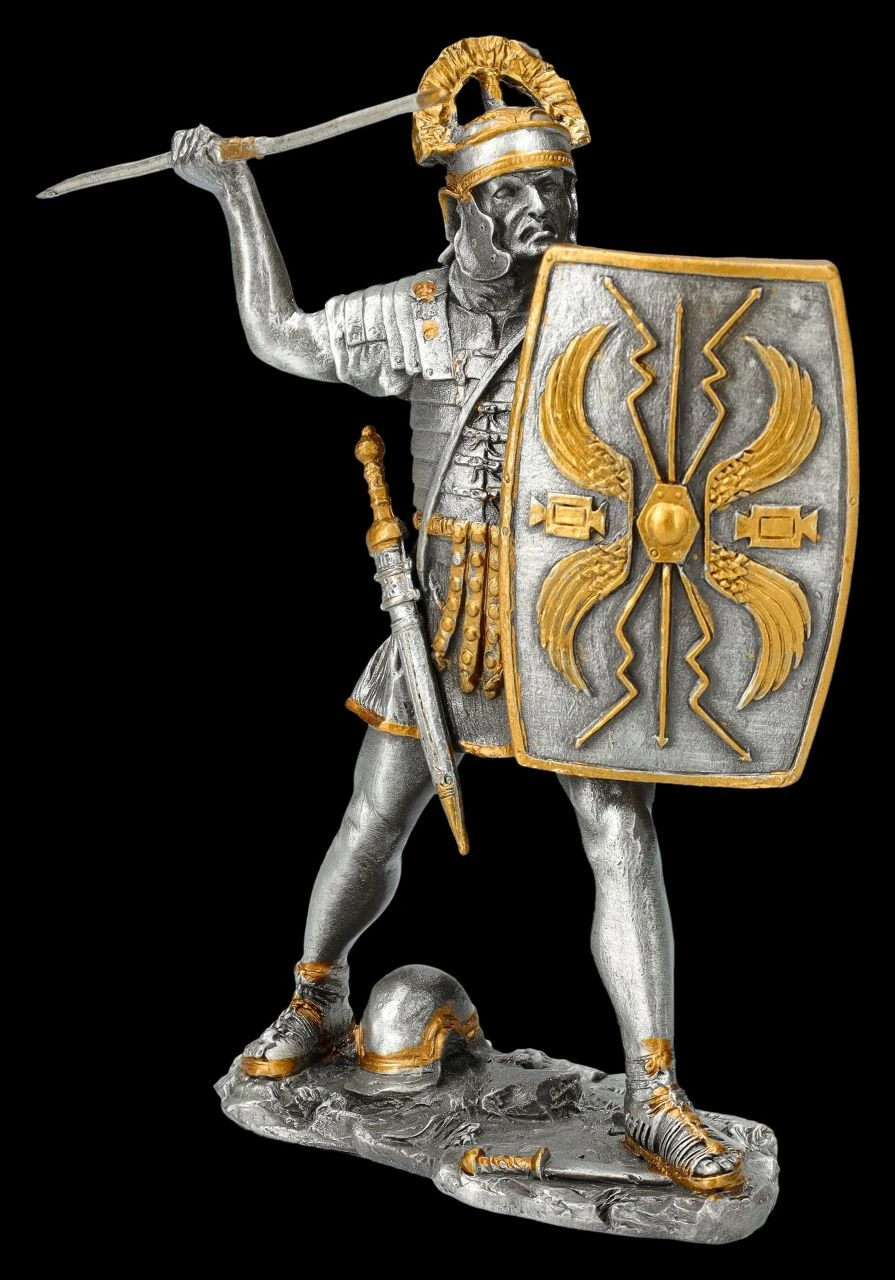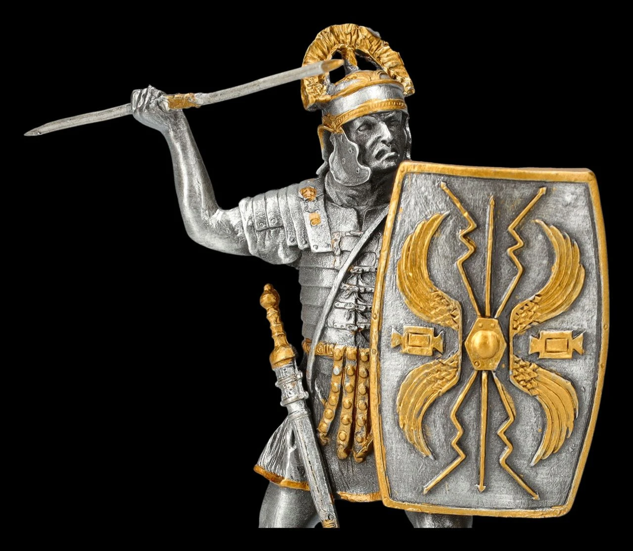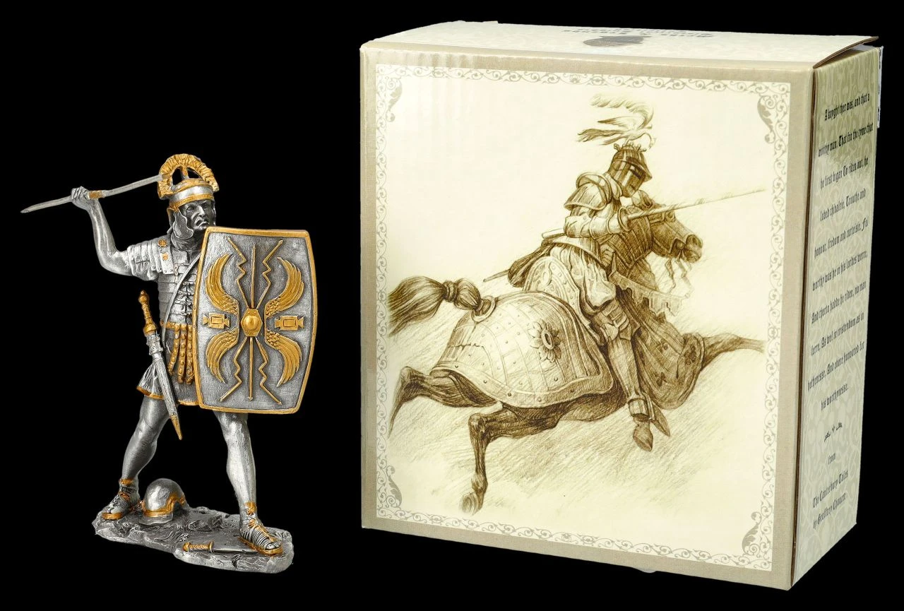 In voller Rüstung, mit seinem Schwert an der Seite und mit weiteren Waffen ausgestattet steht der römische Legionär kampfbereit da. Sein rechter Arm mit der Waffe holt gerade weit aus und auf dem Boden liegt bereits der Helm und der Dolch eines Besiegten. In der linken Hand hält der Legionär das Schild mit dem Wappen seines Heerführers hoch. Die fantastische Zinnffigur eines römischen Legionärs im Kampf stammt aus der Historical Knights Collection von Veronese. Die 11 cm hohe, 10 cm breite und 3,5 cm tiefe Zinnfigur wurde mit feinen goldenen Akzenten von Hand bemalt. Sie wird inklusive Geschenkkarton verschickt und ist damit ein perfektes Geschenk für alle Sammler.